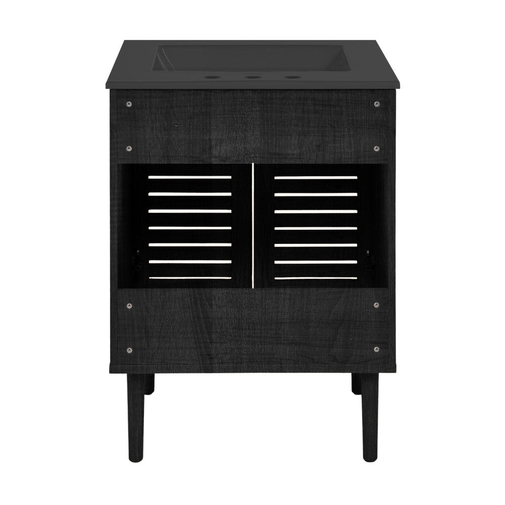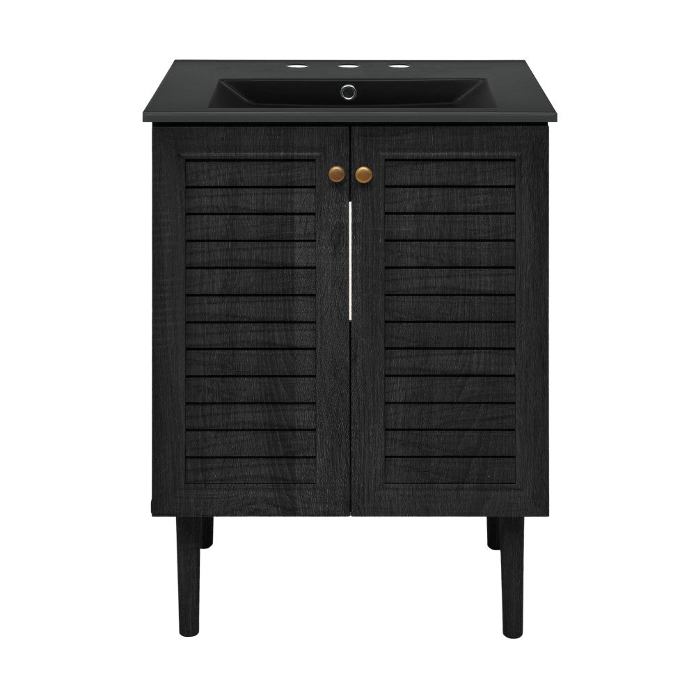 Celebrate the allure of bronze in the Bron collection, where metallic accents and modern elements converge. Tailor your bathroom to perfection with our cabinets-only vanities, offering customizable vanity top solutions to integrate with your design vision. Offered in black oak with a matte black sink top.
