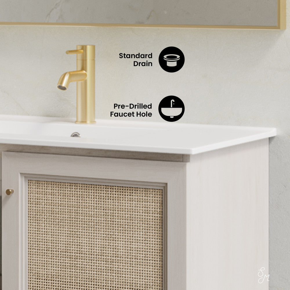 Elevate your living space with the timeless elegance of the Classe collection, embodying sophistication, and refinement. Transform your bathroom into a sanctuary of style and functionality with our exquisite bathroom vanities, meticulously crafted to reflect your unique taste. Offered in white oak with a glossy white sink top.