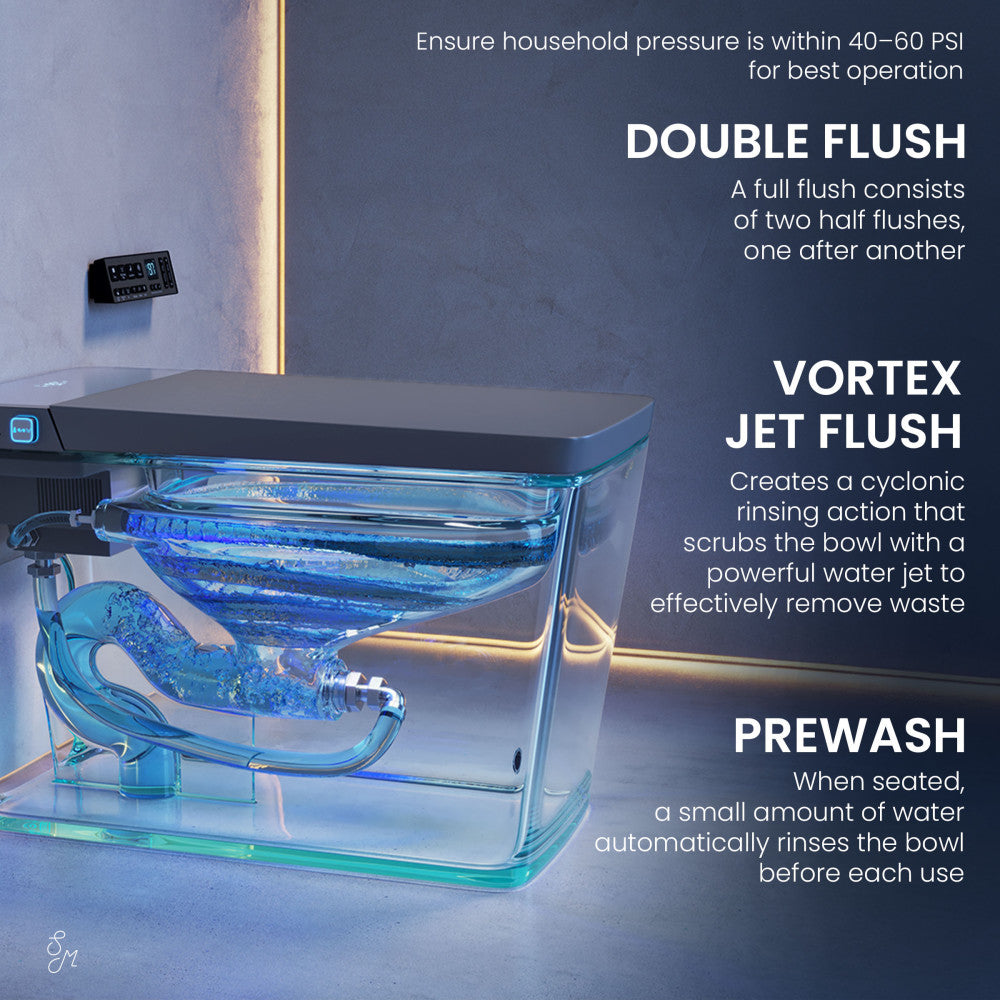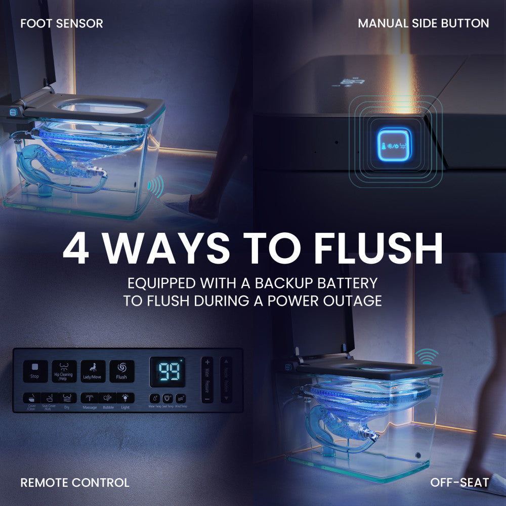 • Flush Technology: Features multiple flushing options for convenience and hygiene, including a manual side button, automatic flush upon standing, and remote control activation