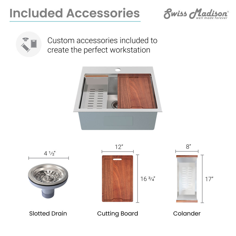 - Included: Mounting clips, cutout template, slotted drain, cutting board, and colander.