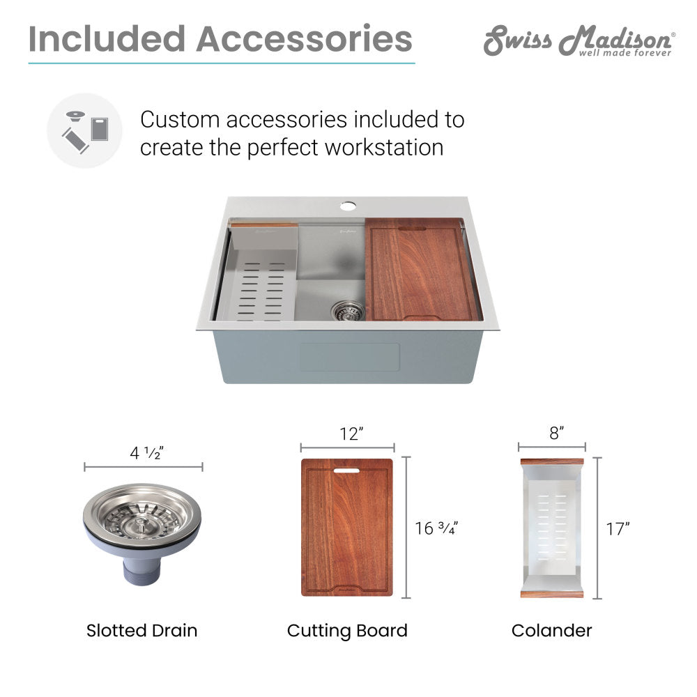 - Included: Mounting clips, cutout template, slotted drain, cutting board, and colander.
