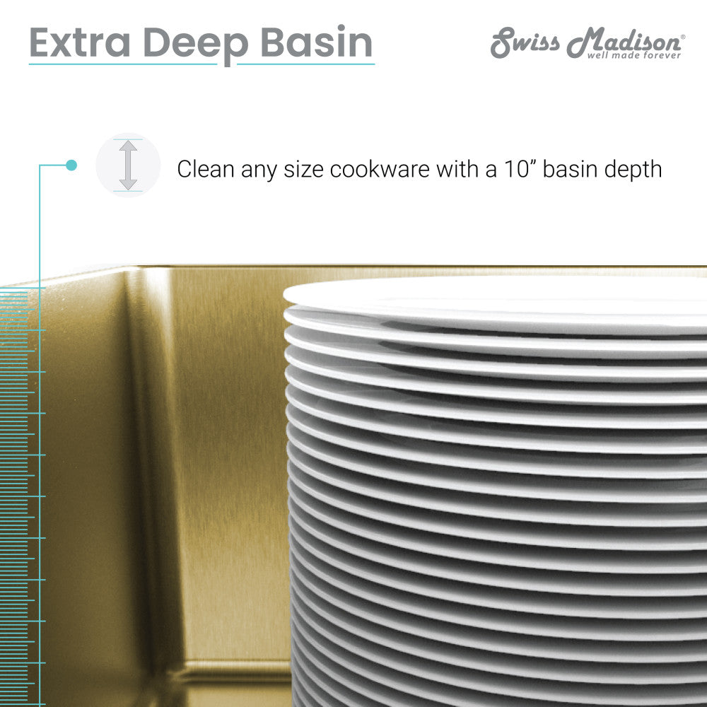 Immerse yourself in coastal tranquility with the Rivage collection, embracing relaxed elegance and natural textures. Infuse rustic charm and modern convenience into your kitchen with our farmhouse sinks, blending traditional appeal with contemporary utility. Offered in stainless steel with a brushed gold finish.