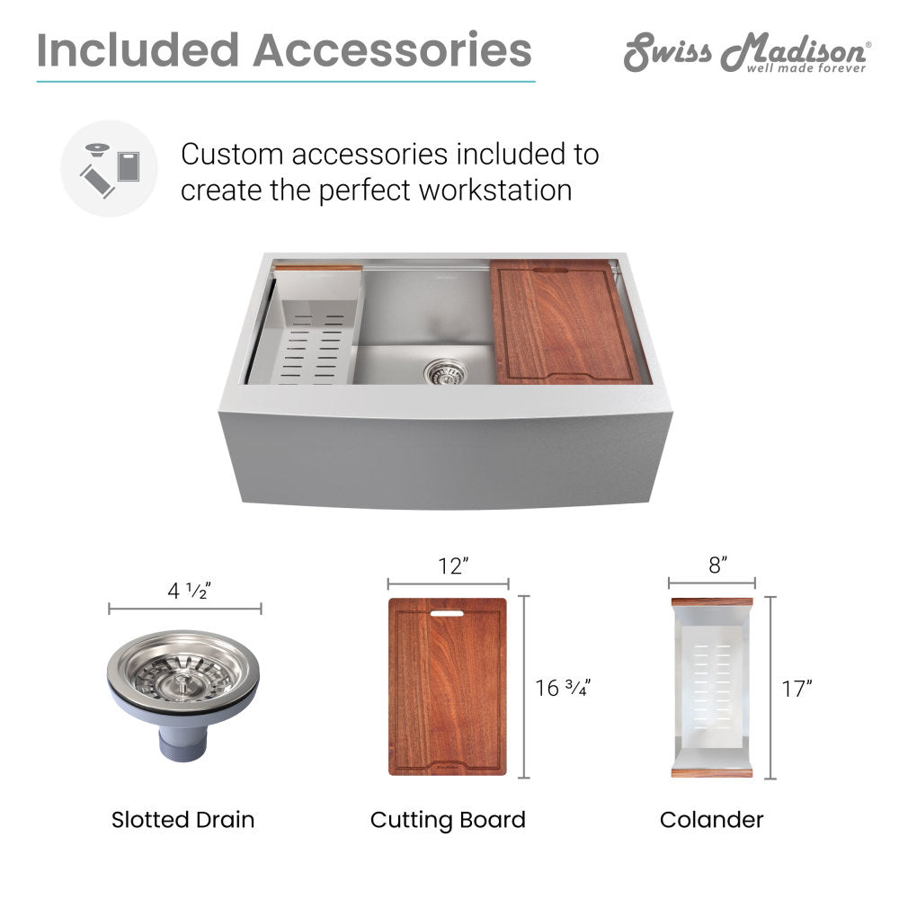 - Included: Cutout template, slotted drain, cutting board, and colander.