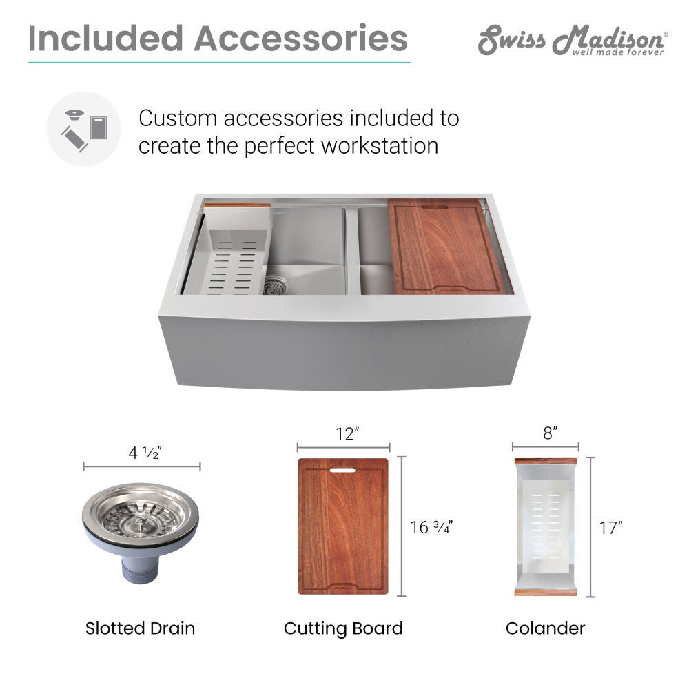 - Included: Cutout template, slotted drain, cutting board, and colander.
