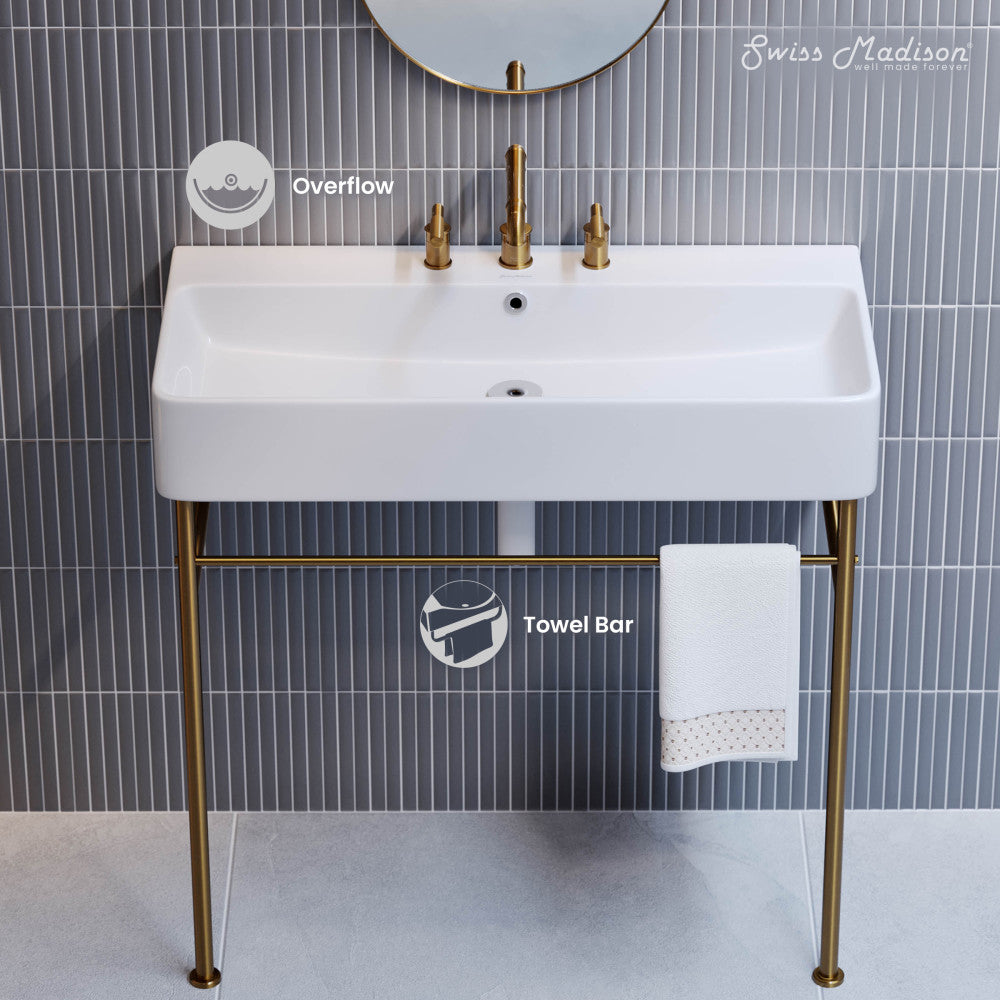 Carre 36" Console Sink White Basin Brushed Gold Legs with 8" Widespread Holes