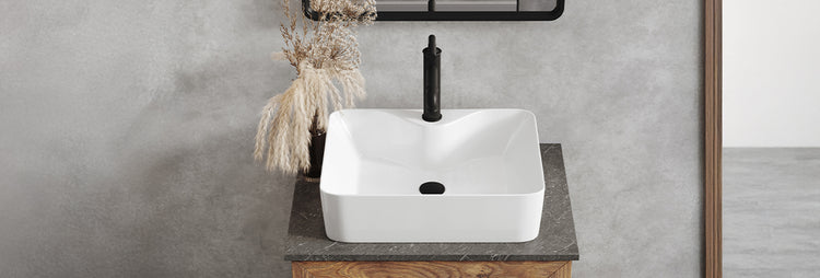 Vessel sinks sit above the counter, creating a bold focal point and elevated bathroom design.