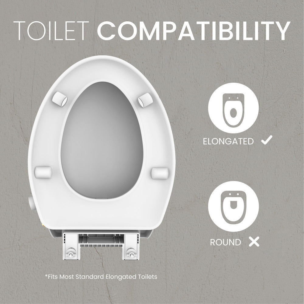 - Elongated Seat: The seat is compatible with standard elongated toilets to provide extra room and comfort