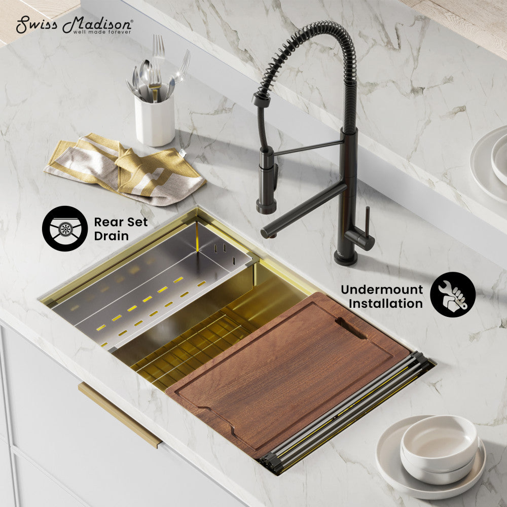 Discover the art of curves and lines with the Tourner collection, where fluid designs redefine contemporary aesthetics. Elevate your kitchen aesthetics with our undermount sinks, showcasing sleek design and maximum counter space. Offered in stainless steel with a brushed gold finish.