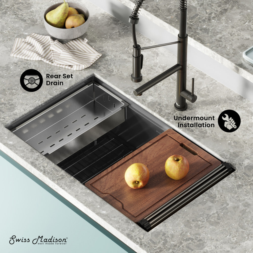 • Undermount Installation: Designed to fit beneath the countertop and cabinetry to provide a seamless look.