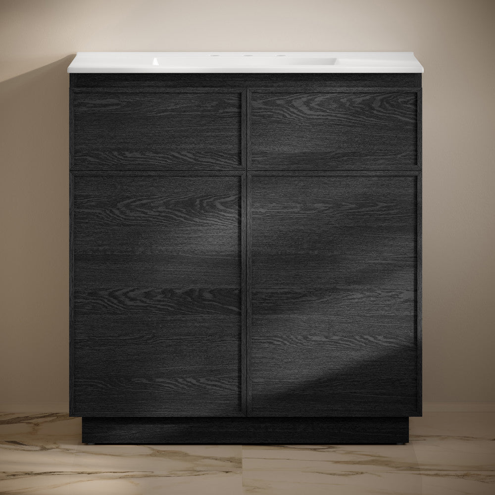 Capture the essence of coastal sophistication with the St. Tropez collection, evoking the breezy allure of Mediterranean living. Transform your bathroom into a sanctuary of style and functionality with our exquisite bathroom vanities, meticulously crafted to reflect your unique taste. Offered in black oak with a glossy black sink top.