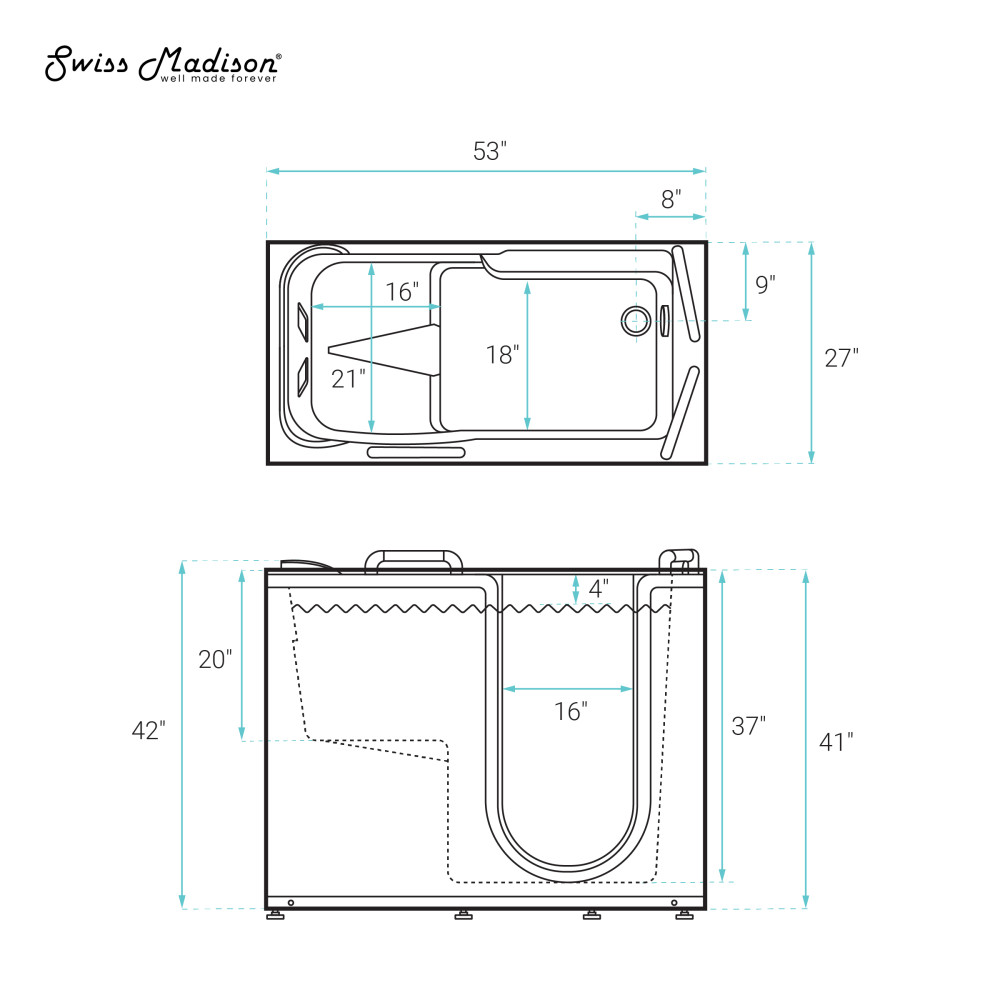 - Chair Height: The built-in ADA height seat and conveniently located grab bars allow users to bathe with greater privacy and ease