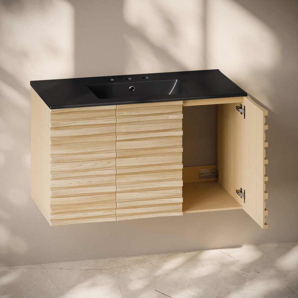 Cascade 36" Wall-Mounted Bathroom Vanity in Natural Oak with Black 3-Hole Widespread Sink Top