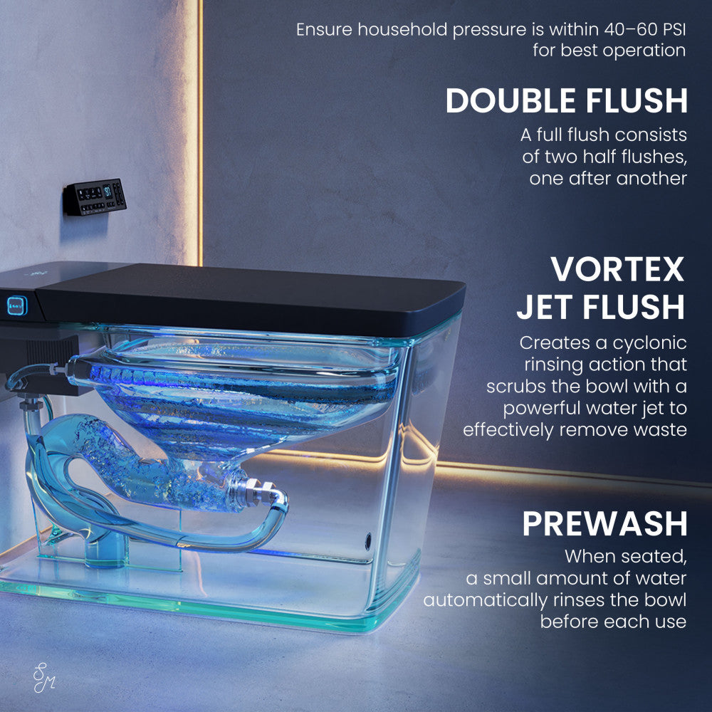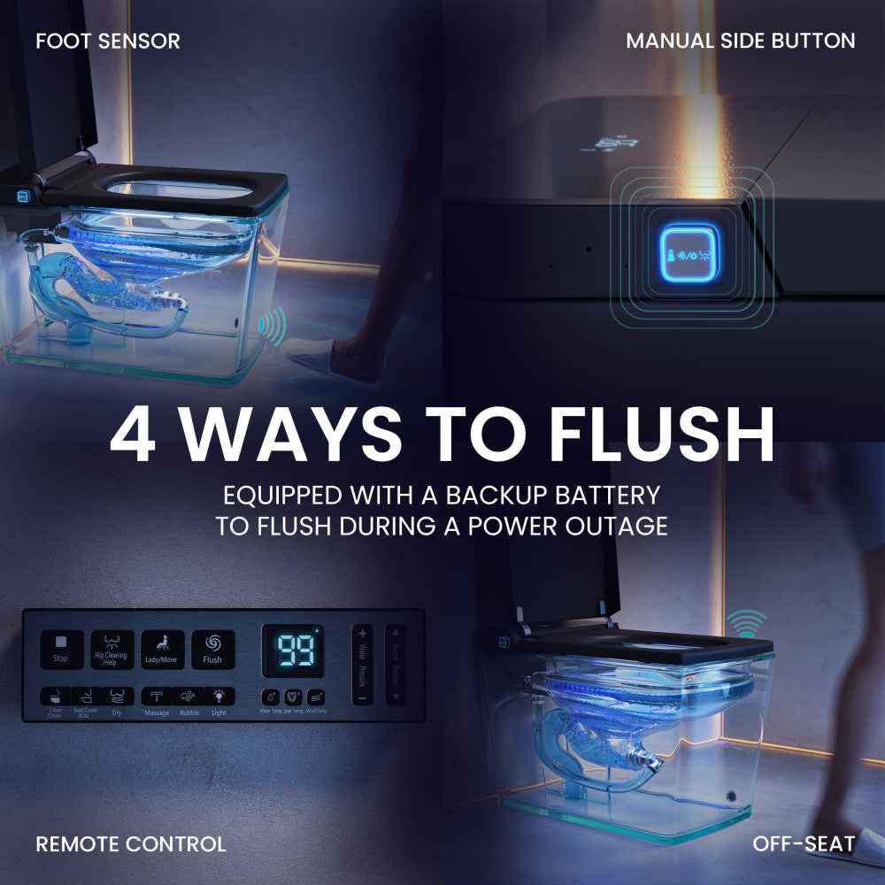 - Flush Technology: Features multiple flushing options for convenience and hygiene, including a manual side button, automatic flush upon standing, and remote control activation