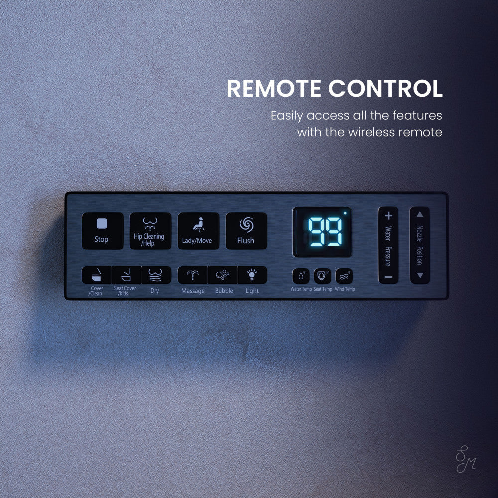 - Remote and Side Control Options: Full remote control and an integrated side panel to conveniently operate the flush and manage bidet functions directly from the side of the seat
