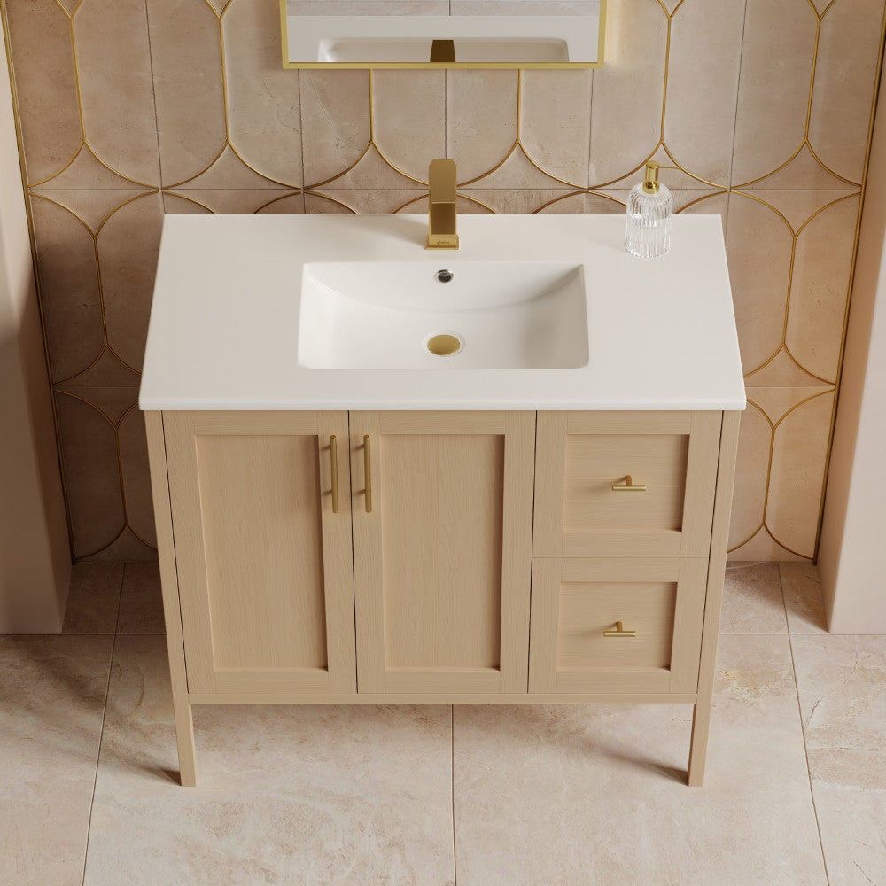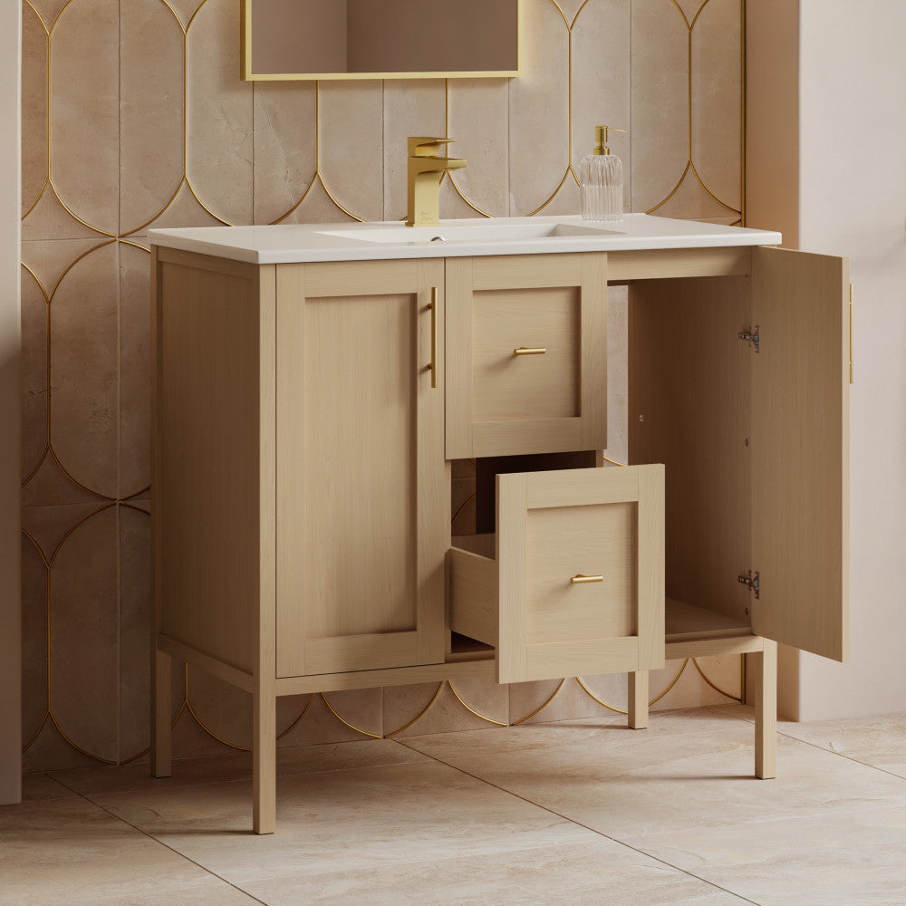 Defined by artful structure and modern charm, the Forme Collection highlights sculptural shapes and smooth finishes that elevate your home with understated style. Transform your bathroom into a sanctuary of style and functionality with our exquisite bathroom vanities, meticulously crafted to reflect your unique taste. Offered in natural oak with a glossy white sink top.