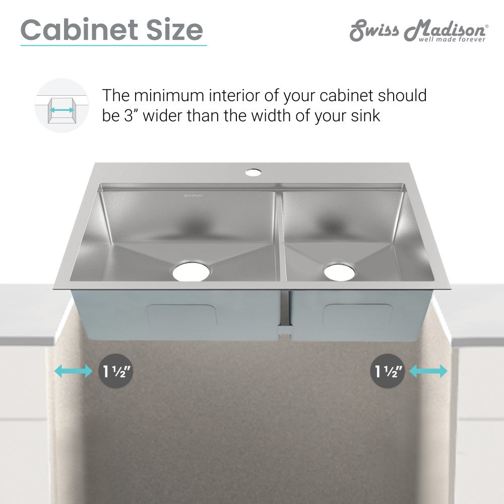 - Cabinet Size: The minimum interior of your cabinet should be 3" wider than the width of your sink.