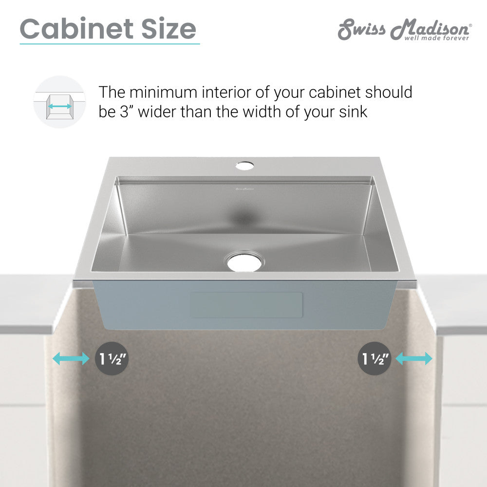 - Cabinet Size: The minimum interior of your cabinet should be 3" wider than the width of your sink.