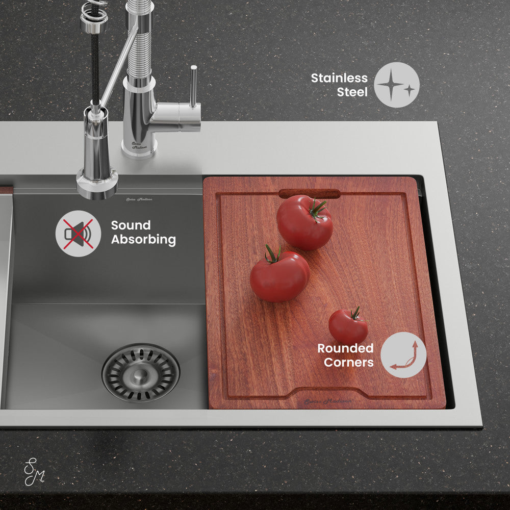 Delight in the Ravi collection, where exquisite designs elevate the functionality and aesthetics of your home. Transform your kitchen sink into a hub of culinary creativity with our workstation sinks, offering integrated accessories for ultimate functionality. Offered in stainless steel with a polished finish.