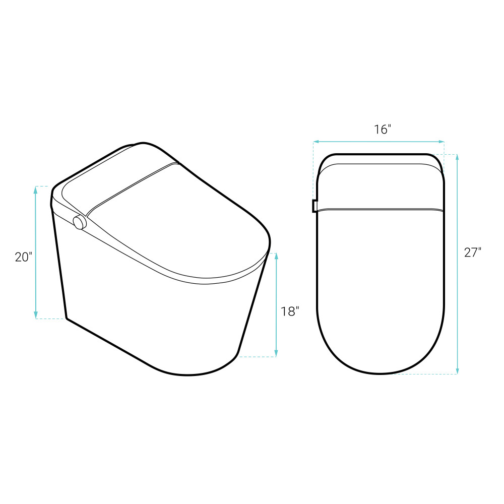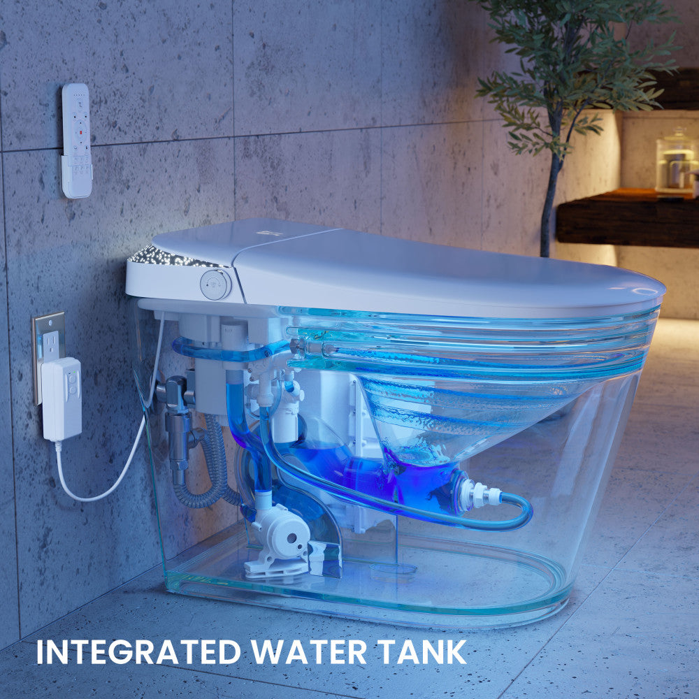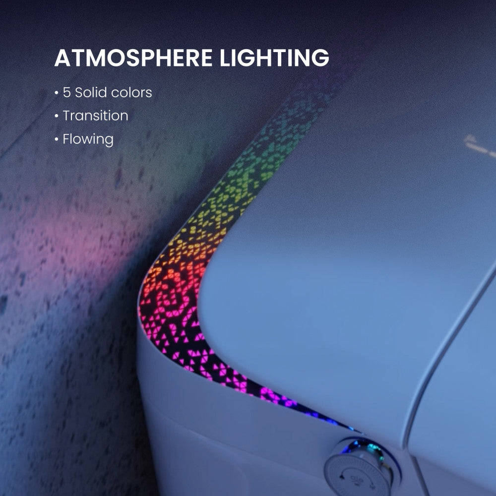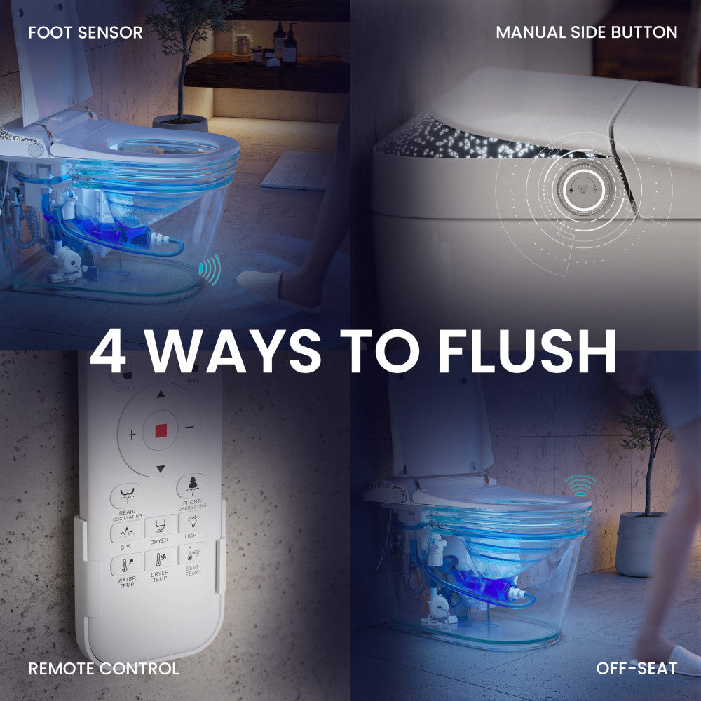 - Flush Technology: Features multiple flushing options for convenience and hygiene, including a manual side button, touchless foot sensor, automatic flush upon standing, and remote control activation