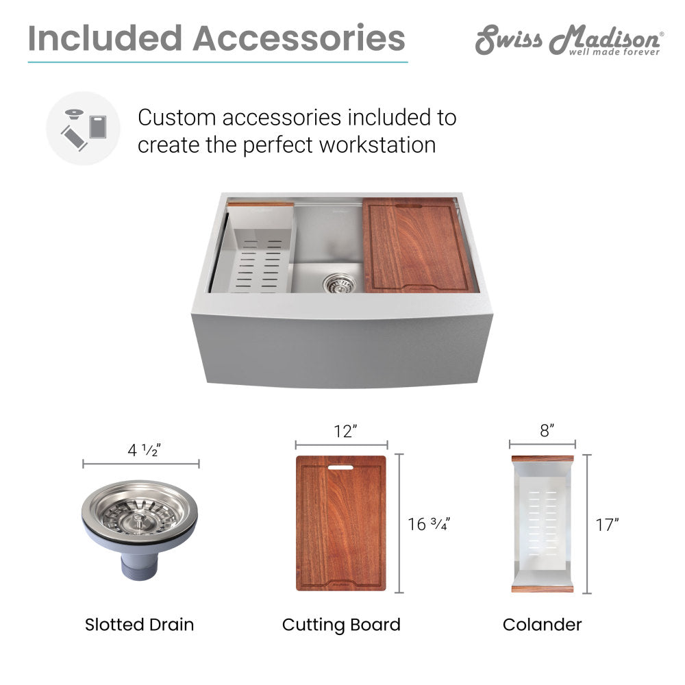 - Included: Cutout template, slotted drain, cutting board, and colander.