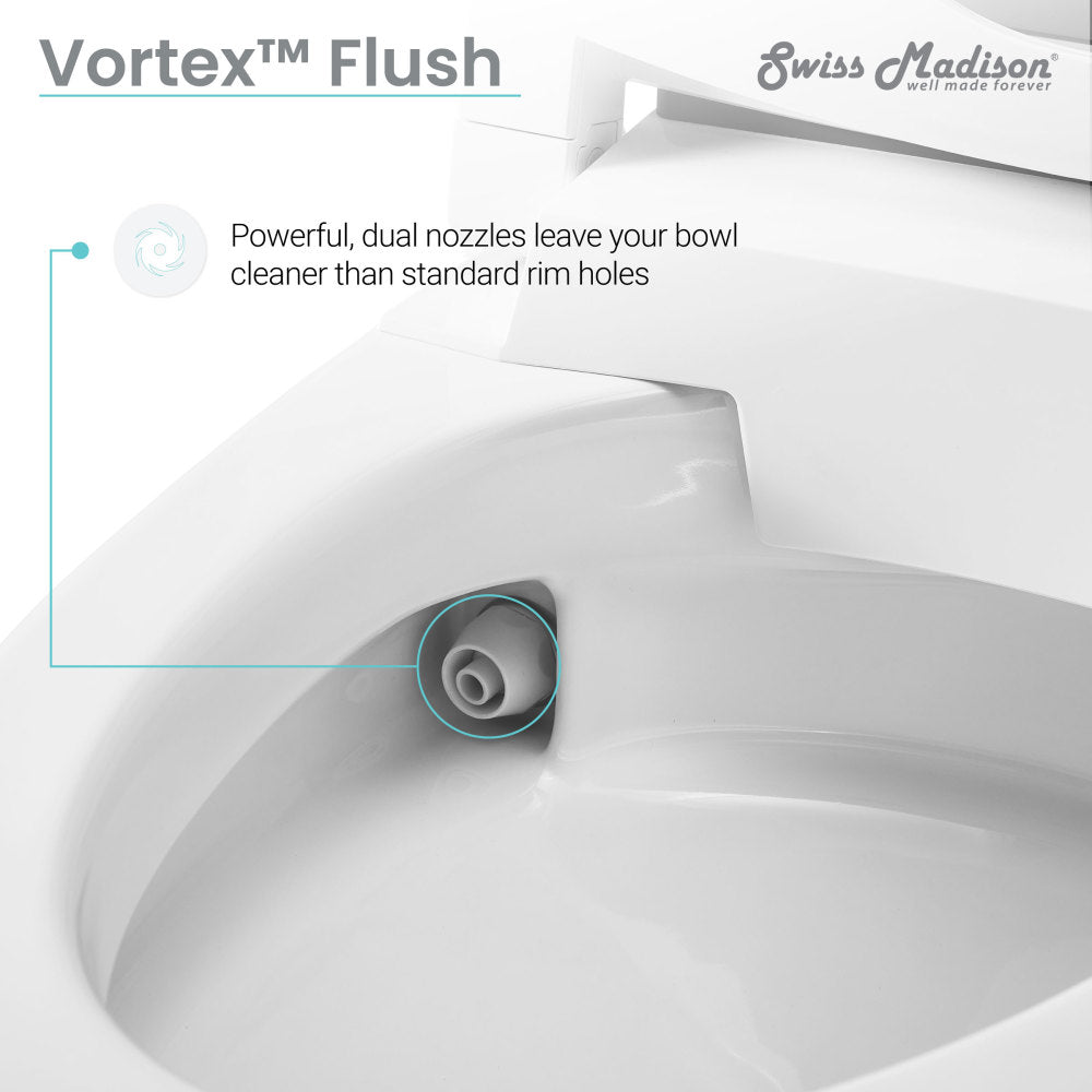 • Dual Vortex™ Flush: Creating a cyclonic rinsing action that scrubs the bowl to ensure superior waste disposal using a minimum of 1.1 gallons per flush for water efficiency and maximum flush capacity of 1.6 gallons.